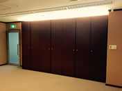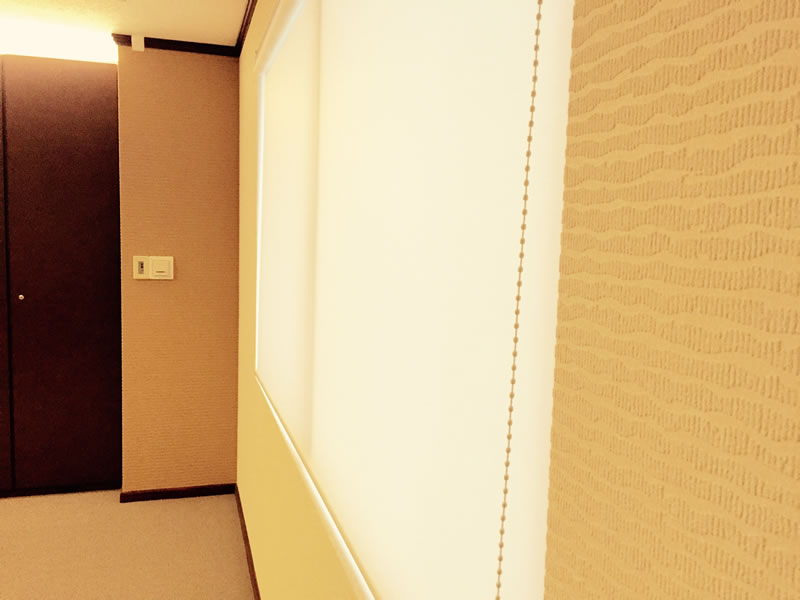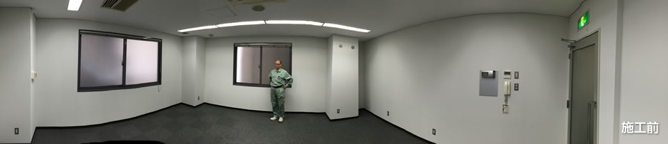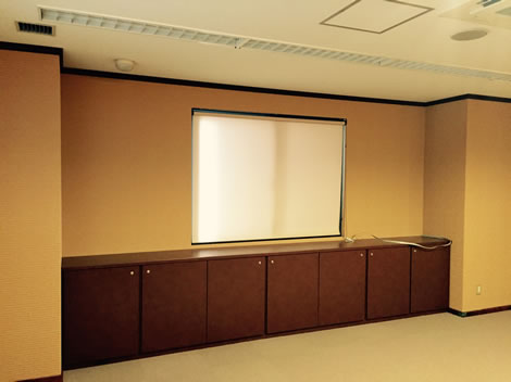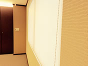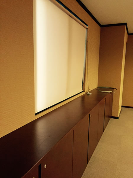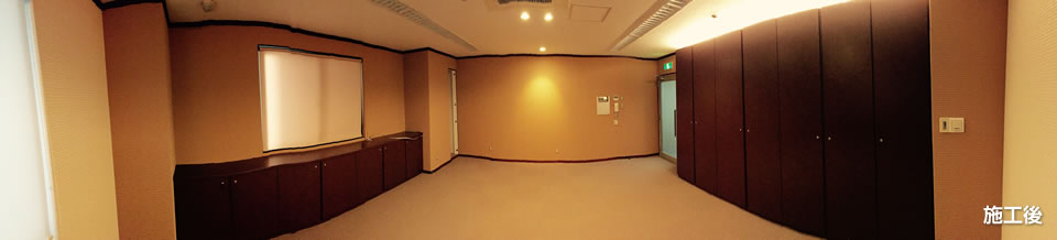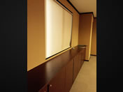 天井:石膏ボードOP仕上げ 廻縁:ホワイトアッシュ無垢OSCL仕上げ 壁:ビニールクロス貼り 什器:レザー調メラミン 巾木:ホワイトアッシュ無垢OSCL仕上げ 床:タイルカーペット 照明器具:LEDダウンライト 設計・施工 ㈱杉本工務店