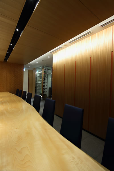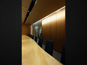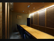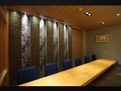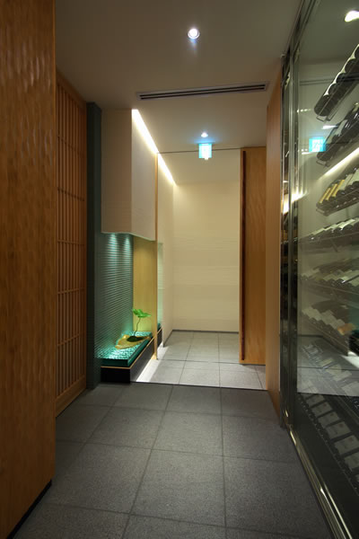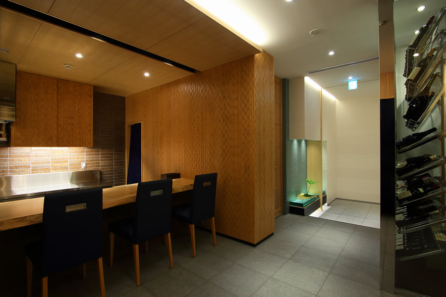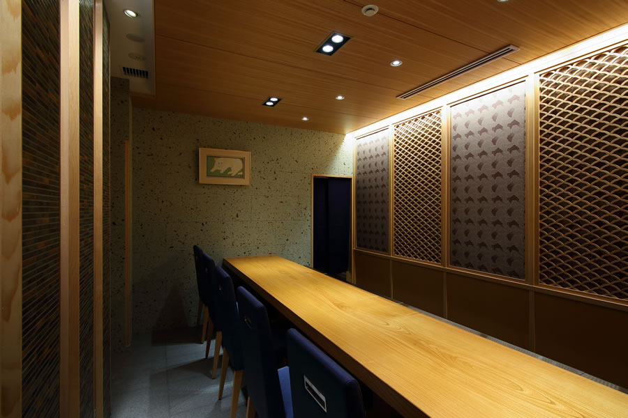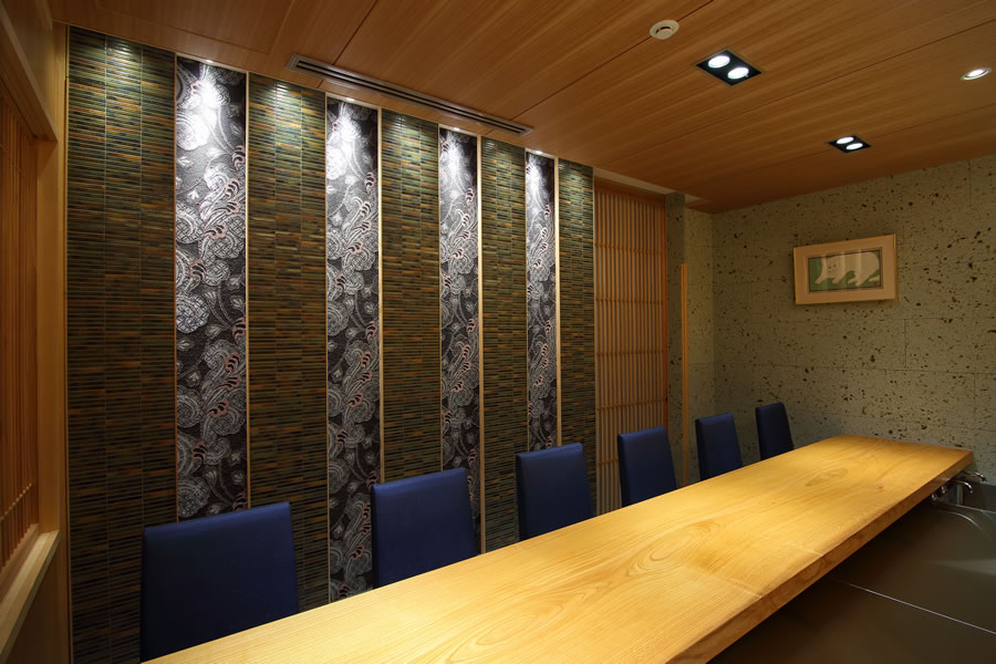 壁 :大谷石貼、JOTAROデザイン織物ファブリック、タニハタ組子(青海波)
