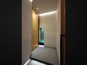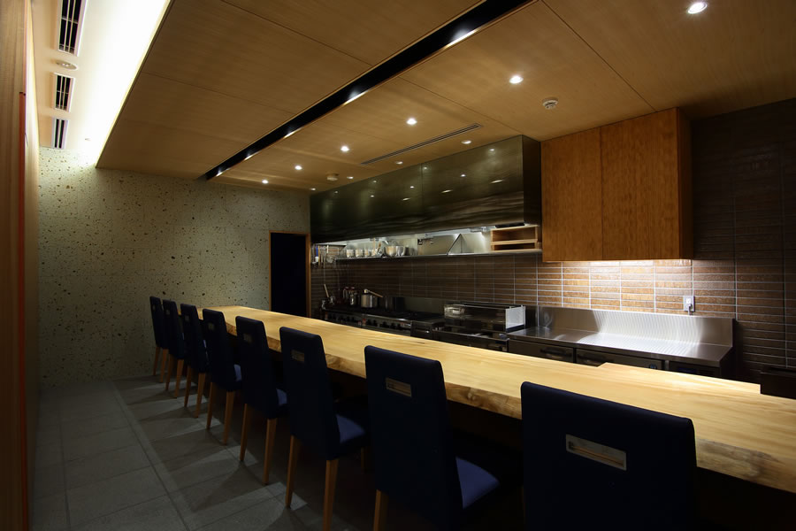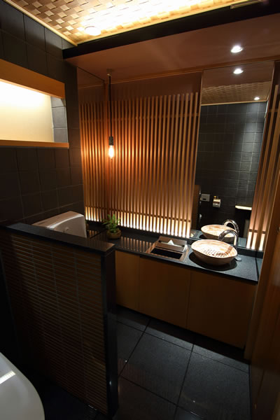 壁 :大谷石貼、ボーダータイル貼、JOTAROデザイン織物ファブリック、御影石本磨き