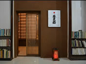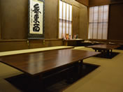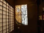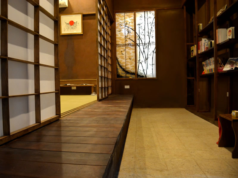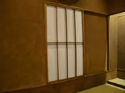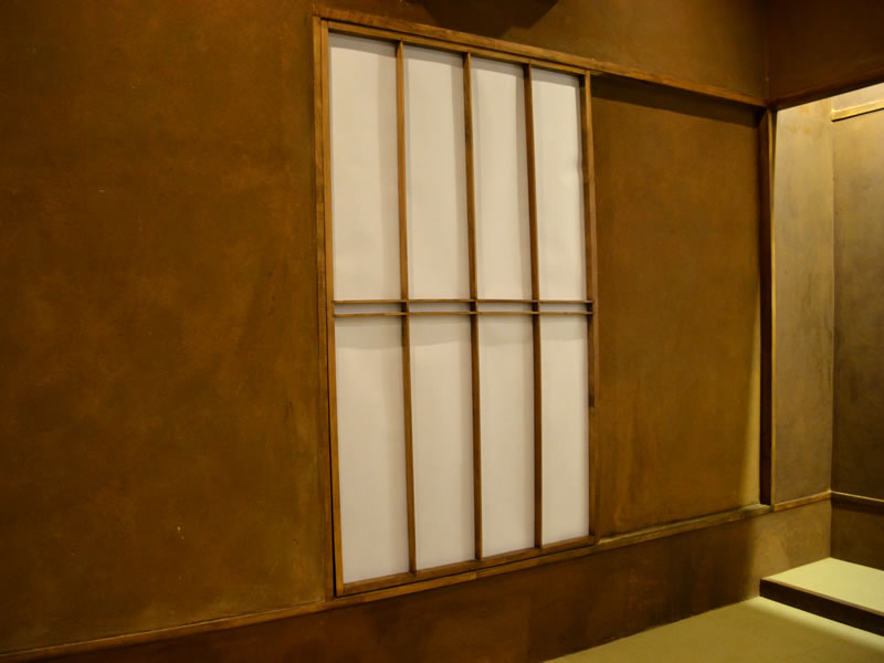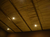 天井:竿天井葭簀・網代(スーダン風) 壁:ゴムワラビ塗(スーダン風) 床:畳シート貼り 設計・デザイン:佐藤達郎デザイン事務所 掛け軸は京都清水寺:森清範貫主書